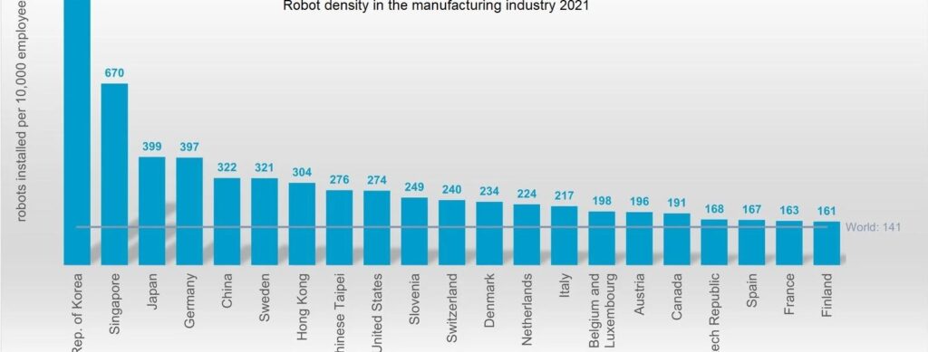 China’s massive investment in industrial robotics has put the country in the top ranking of robot density, surpassing the United States for the first time. The number of operational industrial robots relative to the number of workers hit 322 units per 10,000 employees in the manufacturing industry. Today, China ranks in fifth place. The world´s top 5 most automated countries in manufacturing in 2021 are South Korea, Singapore, Japan, Germany and China. “Robot density is a key indicator of automation adoption in the manufacturing industry around the world,” says Marina Bill, President of the International Federation of Robotics . “The new average of global robot density in the manufacturing industry surged to 141 robots per 10,000 employees – more than double the number six years ago. China’s rapid growth shows the power of its investment so far, but it still has many opportunities to automate.”