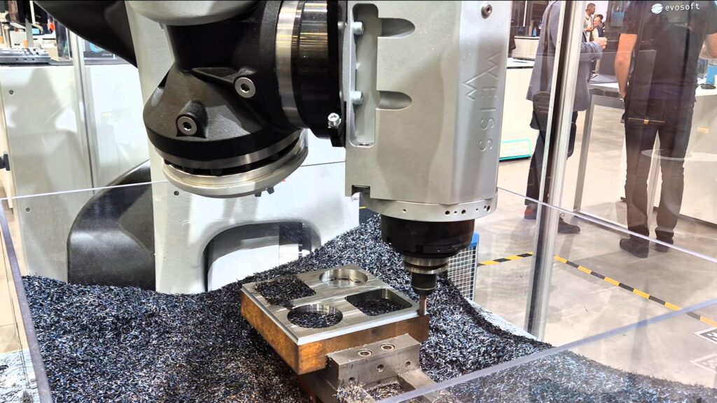 During the trade fair, Siemens presented an industrial robot controlled by Sinumerik Run MyRobot, demonstrating machining operations in C45 structural steel with a tensile strength of approximately 570 to 700 N/mm². The robot was shown carrying out two different machining strategies.